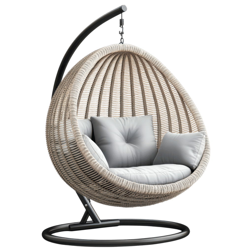 This is a contemporary freestanding hanging egg chair with a woven body, likely made from synthetic rattan or wicker in a natural, light beige or tan color. The chair is suspended from a durable black steel frame with a curved pole and a wide, stable circular base.
