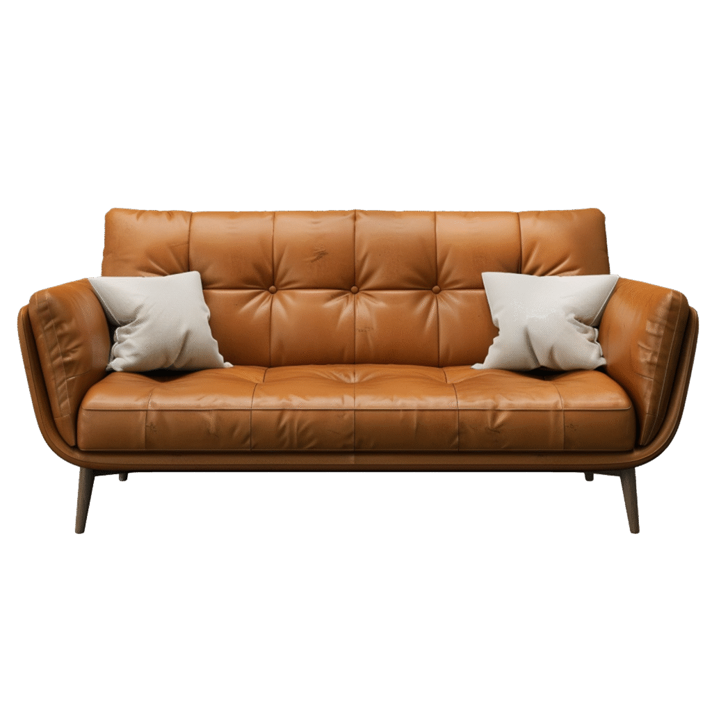 This is an elegant two-seater sofa featuring rich caramel-toned leather upholstery. It presents a mid-century modern aesthetic with deep button tufting on the backrest, gently rolled arms, and splayed wooden legs. It includes two contrasting white throw pillows, offering a blend of classic style and contemporary comfort, perfect for a chic living space.